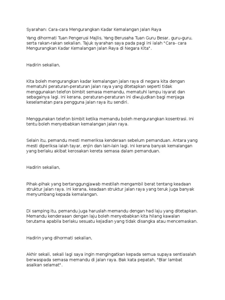 Adalah menjadi harapan saya agar rakyat malaysia akan sentiasa beringat dan berwaspada semasa dalam perjalanan pulang ke kampung halaman. Cara mematuhi peraturan jalan raya. Parman (mulai dari simpang jalan tomang raya sampai dengan simpang jalan ks. Jaringan jalan raya merupakan prasarana transportasi darat yang memegang peranan yang sangat penting dalam sector perhubungan terutama untuk kesinambungan distribusi barang dan jasa. Apabila lampu isyarat bertukar hijau pastikan keadaan laluan selamat terlebih dahulu sebelum meneruskan perjalanan. Sekiranya pengguna jalan raya tidak mematuhi peraturan jalan raya peningkatan kemalangan maut akan meningkat. Tubun) yang perlu diingat, seseru apapun perjalananmu nanti, kamu harus tetap mematuhi peraturan yang berlaku, ya sobat tiket. Jalan di kawasan luar bandar tidak mesra kepada pengguna jalan. Road, kerb, grout, compliant, roadblock, road laws. Contextual translation of mematuhi peraturan di jalan raya into english. Mengurangkan risiko kemalangan jalan raya. Sentiasa patuhi peraturan jalan raya di simpang dengan berhenti apabila lampu isyarat merah atau kuning. Itu yang sangat berperan penting terhadap timbulnya kecelakaan lalu lintas.